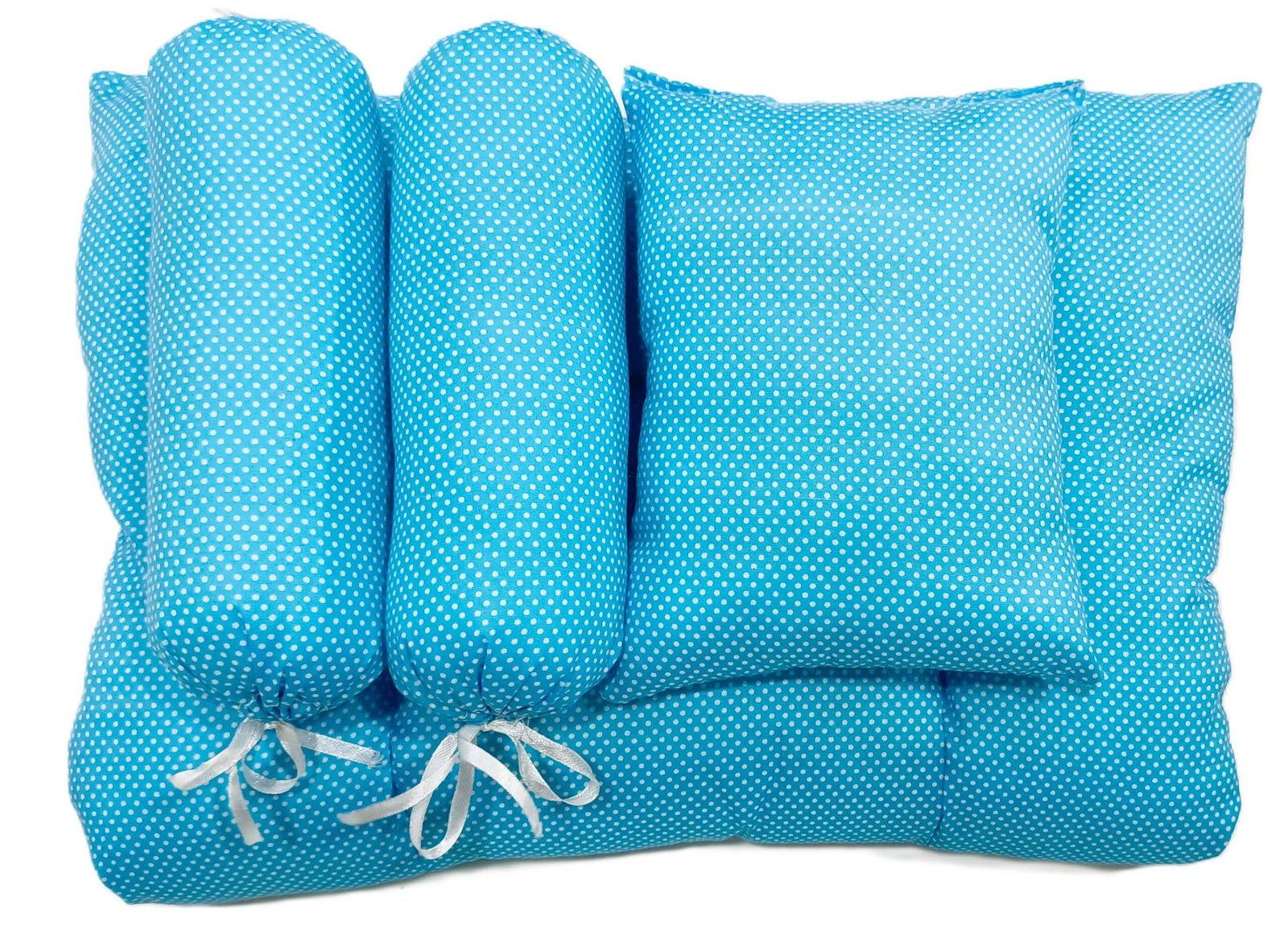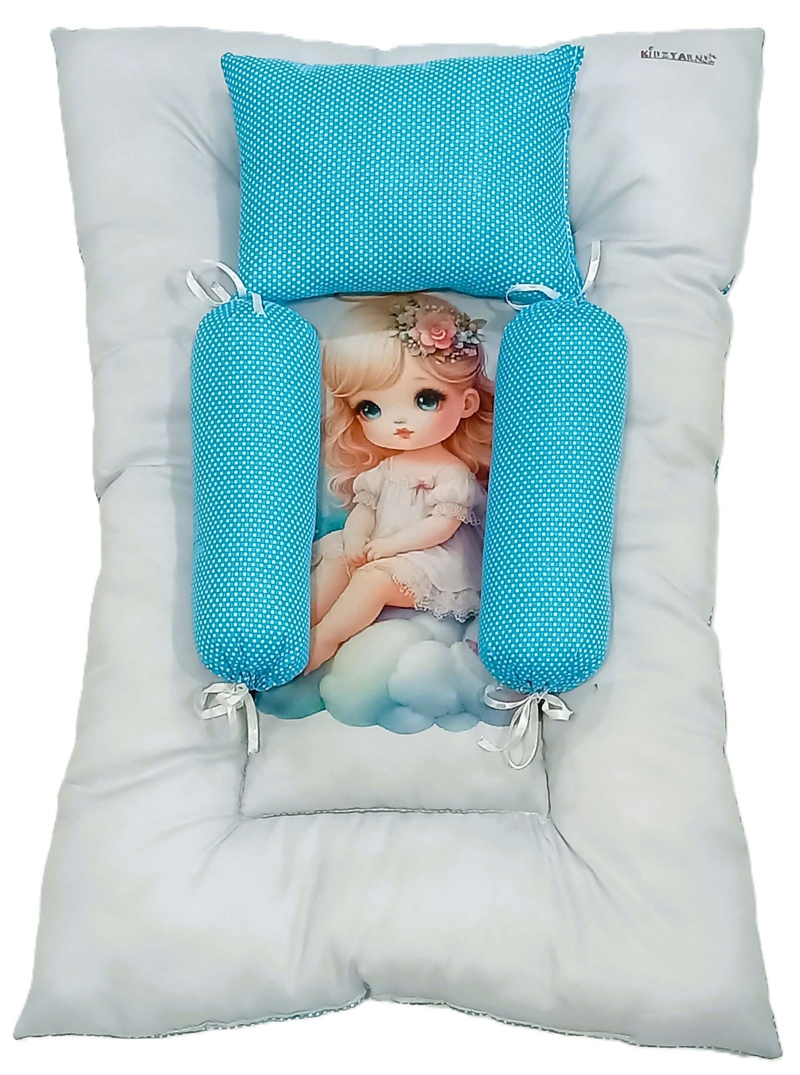 The soft mattress comes with a beautiful printed angel baby design on a cloud, giving a soothing and calming feel. The set includes two side bolsters and a matching pillow in a stylish blue polka dot pattern, which not only enhances the look but also provides proper support to your baby.