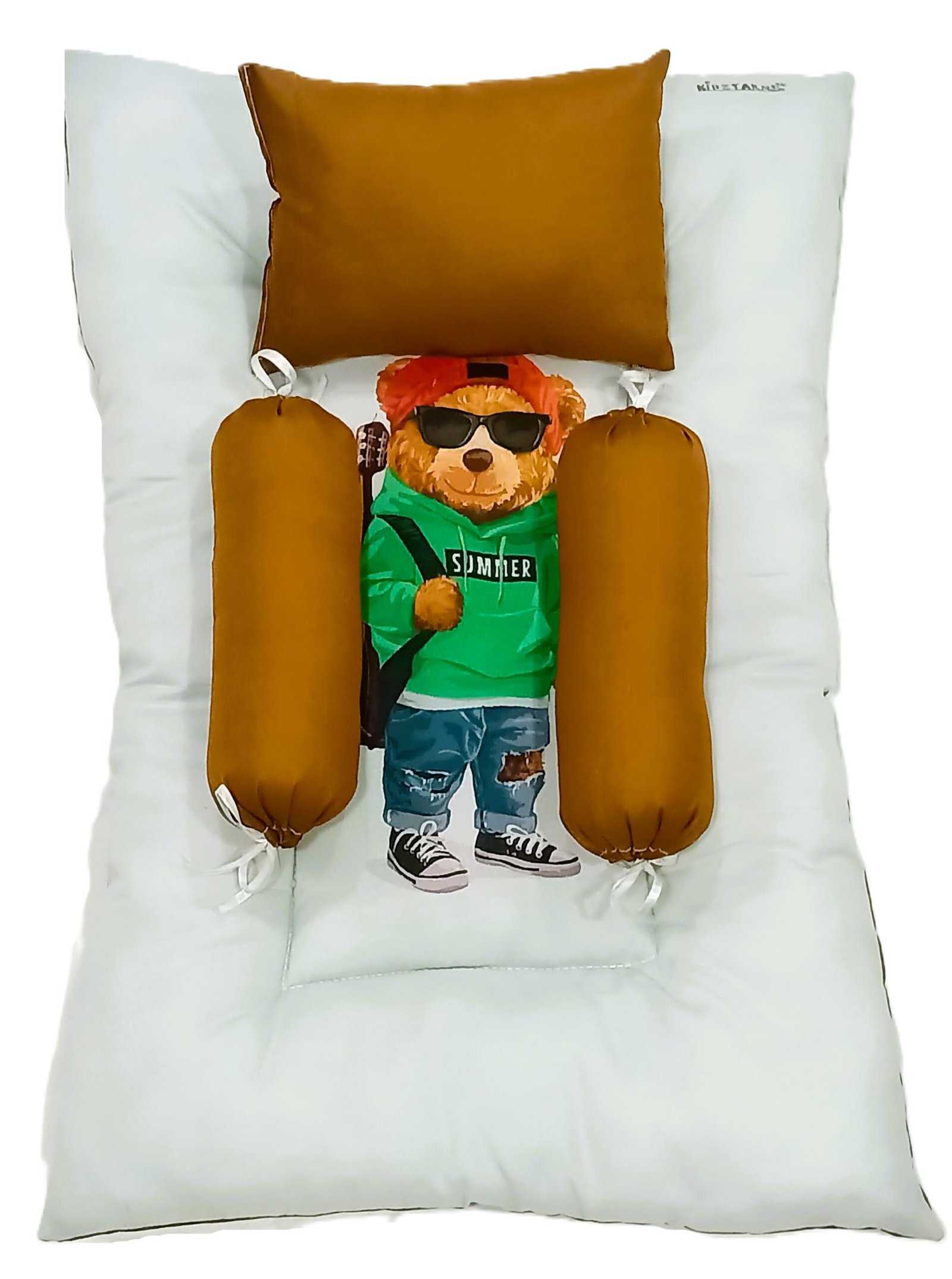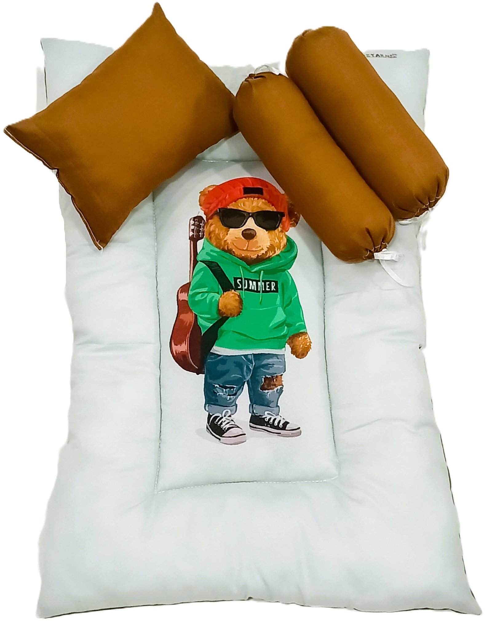 The highlight of this bedding set is its cute teddy design with a stylish look, making it perfect for modern parents who want both comfort and aesthetics. The set includes side pillows and bolsters to give proper support and prevent the baby from rolling over.